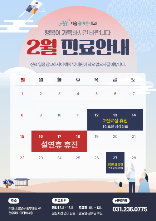 서울올바른내과는 점심시간(13:00~14:00) 에도 원장 1인 진료합니다.